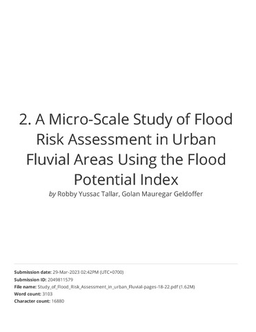 2. Turnitin_A Micro-Scale Study of Flood Risk Assessment in Urban Fluvial Areas Using the Flood Potential Index.pdf Download (1803Kb) | Preview |
