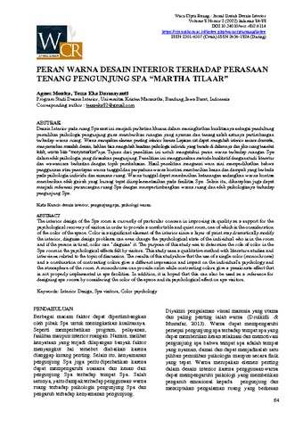 Desain Interior pada ruang Spa saat ini menjadi perhatian khusus dalam meningkatkan kualitasnya sebagai pendukung pemulihan psikologis pengunjung guna memberikan ruangan yang nyaman dan tenang salah satunya pertimbangan terhadap warna ruang. Warna merupakan elemen penting interior karena Lapisan cat dapat mengubah interior secara dramatis, menyamarkan masalah desain, bahkan bisa mengubah keadaan psikologis individu yang berada di dalamnya dan jika orang tersebut lelah, warna bisa “menyamarkan”nya. Tujuan dari penelitian ini untuk mengetahui peran warna terhadap ruangan Spa dalam efek psikologis yang dirasakan pengunjung. Penelitian ini menggunakan metode kualitatif dengan studi literatur dan wawancara berkaitan dengan topik pembahasan. Hasil penelitian mengenai warn aini memperlihatkan bahwa penggunaan atau penetapan warna tunggal dan perpaduan warna kontras memberikan kesan dan dampak yang berbeda pada psikologis individu dan suasana ruang. Warna tunggal dapat memberikan ketenangan sedangkan warna kontras memberikan efek gairah yang kurang tepat diimplementasikan pada fasilitas Spa. Selain itu, diharapkan juga dapat menjadi referensi perancangan ruang Spa dengan mempertimbangkan warna ruang dan efek psikologisnya terhadap pengunjung Spa.