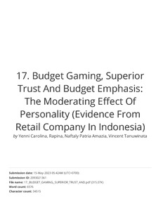17. Turnitin_Budget Gaming, Superior Trust And Budget Emphasis_ The Moderating Effect Of Personality (Evidence From Retail Company In Indonesia).pdf Download (3105Kb) | Preview |