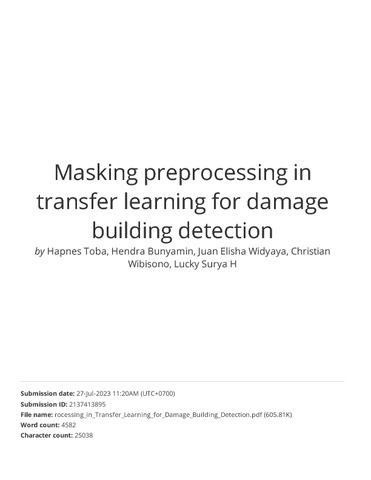Toba, Hapnes and Bunyamin, Hendra and Widyaya, Juan Elisha and Wibisono, Christian and Haryadi, Lucky Surya (2023) Masking Preprocessing in Transfer Learning for Damage Building Detection. IAES International Journal of Artificial Intelligence, 12 (2). pp. 552-559. ISSN 2252-8938