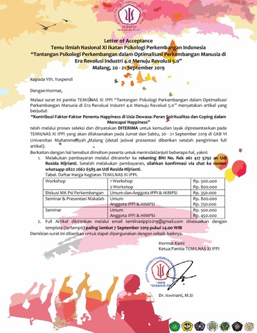 Yuspendi, Yuspendi (2019) Kontribusi Faktor-Faktor Penentu Happiness Di Usia Dewasa: Peran Spiritualitas Dan Coping Dalam Mencapai Happiness. In: Temu Ilmiah Nasional XI Ikatan Psikologi Perkembangan Indonesia (IPPI): Tantangan Psikologi Perkembangan dalam Optimalisasi Perkembangan Manusia di Era Revolusi Industri 4.0 Menuju Revolusi Peradaban 5.0, 20-21 September 2021, Malang.
