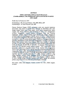 Demam Berdarah Dengue (DHF) merupakan salah satu masalah kesehatan masyarakat yang utama di seluruh dunia. Penyakit ini disebabkan oleh virus dengue dengan vektor utama Aedes egypti. Upaya untuk mengendalikan Aedes aegypti yaitu dengan memutus siklus kehidupan di tahap larva menggunakan larvisida. Penggunaan larvisida kimiawi berdampak tidak baik terhadap lingkungan. Dampak negatif tersebut dapat diminimalisir dengan penggunaan larvisida alami yaitu daun pegagan (Centella asiatica (L.) Urb.). Tujuan penelitian ini adalah untuk mengetahui efek infusa daun pegagan sebagai larvisida terhadap nyamuk larva instar III nyamuk Aedes aegypti. Penelitian ini menggunakan desain penelitian eksperimental murni laboratorik menggunakan rancangan acak lengkap (RAL). Efek larvisida Infusa Daun Pegagan (IDP) diuji terhadap 6 kelompok (n=100, r=5) larva Aedes aegypti berturut-turut diberi perlakuan kelompokI (IDP 0,5%), II (IDP 1%), III (IDP 2%), IV (IDP 4%) , V( temephos 1% sebagai kontrol positif) dan VI (akuades sebagai kontrol negatif). Data yang diukur adalah persentase jumlah larva yang mati setelah 24 jam. Analisis data menggunakan ANAVA satu arah dengan α= 5%. Apabila bermakna dilanjutkan dengan Multiple Comparison Fisher’s LSD). Hasil penelitian persentase larva mati pada kelompok I (30,8%), II (46%), III (55,2%), IV (68,2%) menunjukkan perbedaan yang sangat signifikan (p<0,01) terhadap kelompok VI (2,6%). Terdapat perbedaan yang sangat signifikan (p<0,01) antara kelompok I,II,III, IV terhadap kelompok V (100%). Simpulan penelitian adalah Infusa Daun Pegagan (Centella asiatica (L.)Urb.) berefek sebagai larvisida terhadap larva Aedes aegypti dan memiliki potensi yang tidak setara atau lebih lemah dibandingkan temephos.
