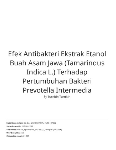 Wijaya, Fatta and Kurnia, Calvin and Sugiaman, Vinna Kurniawati (2022) Efek Antibakteri Ekstrak Etanol Buah Asam Jawa (Tamarindus Indica L.) terhadap Pertumbuhan Bakteri Prevotella Intermedia. Prodenta Journal of Dentistry, 6 (2). pp. 643-653. ISSN 2597-4912