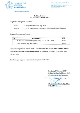 Sihite, Ganda S. and Setiadhi, Riani and Sugiaman, Vinna K. (2023) Efek Antibakteri Ekstrak Etanol Kulit Bawang Merah (Allium ascalonicum) terhadap Streptococcus sanguinis. e-Gigi, 11 (2). pp. 152-160. ISSN 2338-199X
