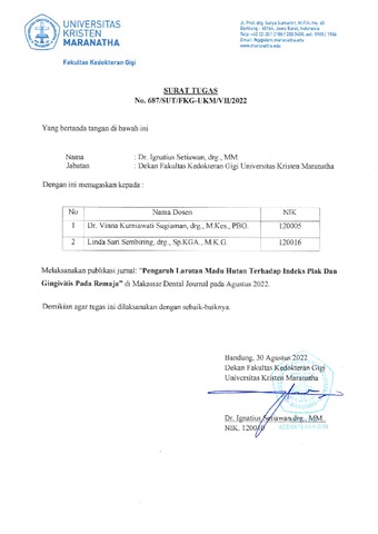Savitri, Thalissa Miranda and Sembiring, Linda Sari and Sugiaman, Vinna Kurniawati (2022) The Effect of Forest Honey Solution on the Plaque and Gingivitis Index in Adolescent. Makassar Dental Journal, 11 (2). pp. 204-210. ISSN 2089-8134