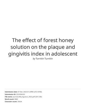Plaque is the main factor that causes dental and oral health problems, one of which is gingivitis. Gingivitis is an inflammation of the gingival tissue and is often found in children, adolescents, and adults. The peak of the highest prevalence of gingivitis occurs in adolescence (90%). Maintaining dental and oral hygiene can be done mechanically by brushing your teeth, but mechanical action will be more effective if combined with chemical action, namely gargling. Forest honey solution is a natural liquid produced by honey bees and is beneficial for dental and oral problems. So, the purpose of this study was to determine the effect of gargling a solution of forest honey on plaque index and gingivitis in the oral cavity of adolescents. The research uses a literature study method by reviewing nationally published journals. The results showed that forest honey has four factors such as organic compounds, osmotic pressure, hydrogen peroxide, and pH. Forest honey are antibacterial and antioxi- dant so that it helps reduce pathogenic bacteria in the oral cavity. It is concluded that gargling a solution of forest honey is effect- tive in reducing plaque and gingivitis index scores in the oral cavity of adolescents.