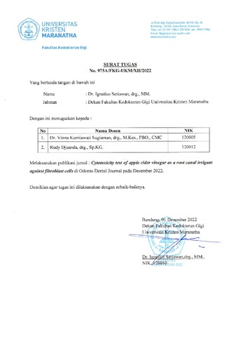 Lesmana, Sylvia Bunga and Djuanda, Rudy and Sugiaman, Vinna Kurniawati (2022) Cytotoxicity Test of Apple Cider Vinegar as a Root Canal Irrigant Against Fibroblast Cells. Odonto Dental Journal, 9 (2). pp. 158-167. ISSN 2460-4119