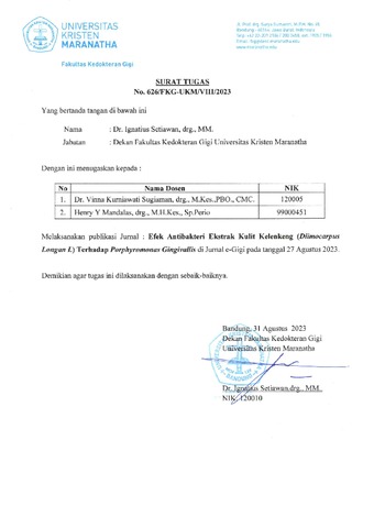 | Uncontrolled Keywords: | periodontitis kronis; ekstrak kulit kelengkeng (Dimocarpus longan L.); metode difusi sumuran; efektivitas antibakteri | ||||||||||||||||