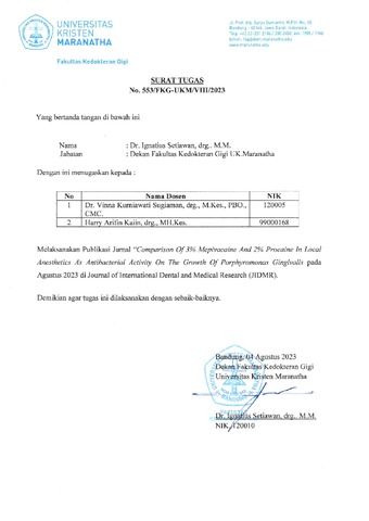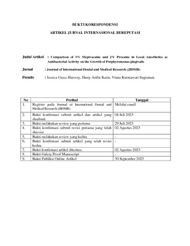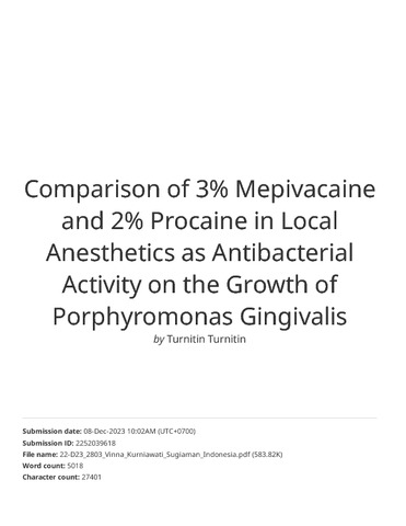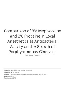 Harvery, Jessica Grace and Kaiin, Harry Arifin and Sugiaman, Vinna K. (2023) Comparison of 3% Mepivacaine and 2% Procaine in Local Anesthetics as Antibacterial Activity on the Growth of Porphyromonas Gingivalis. JIDMR - Journal of International Dental and Medical Research, 16 (3). pp. 1076-1083. ISSN 1309-100X