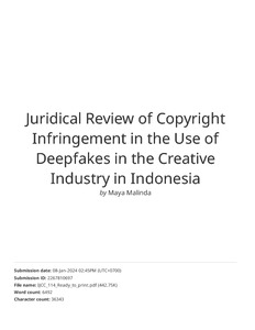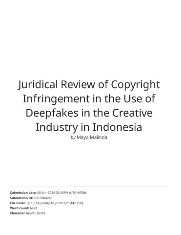 Hendrawan, Daniel and Andersen, Christian and Tiopan, Demson and Kurniawan, Shelly and Malinda, Maya (2023) Juridical Review of Copyright Infringement in the Use of Deepfakes in the Creative Industry in Indonesia. International Journal of Cyber Criminology, 17 (1). pp. 211-222. ISSN 0974–2891