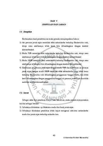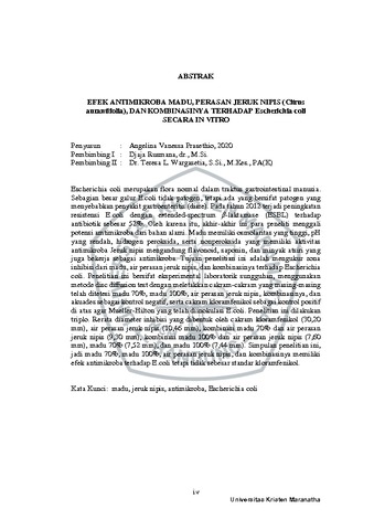 Prasethio, Angelina Vanessa (2020) Efek Antimikroba Madu, Perasan Jeruk Nipis (Citrus aurantifolia), dan Kombinasinya Terhadap Escherichia coli Secara In Vitro. Undergraduate thesis, Universitas Kristen Maranatha.