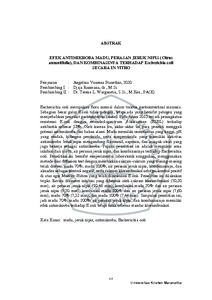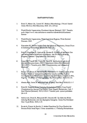 Escherichia coli merupakan flora normal dalam traktus gastrointestinal manusia. Sebagian besar galur E.coli tidak patogen, tetapi ada yang bersifat patogen yang menyebabkan penyakit gastroenteritis (diare). Pada tahun 2012 terjadi peningkatan resistensi E.coli dengan extended-spectrum β-laktamase (ESBL) terhadap antibiotik sebesar 52%. Oleh karena itu, akhir-akhir ini para peneliti menggali potensi amtimikroba dari bahan alami. Madu memiliki osmolaritas yang tinggi, pH yang rendah, hidrogen peroksida, serta nonperoksida yang memiliki aktivitas antimikroba Jeruk nipis mengandung flavonoid, saponin, dan minyak atsiri yang juga bekerja sebagai antimikroba. Tujuan penelitian ini adalah mengukur zona inhibisi dari madu, air perasan jeruk nipis, dan kombinasinya terhadap Escherichia coli. Penelitian ini bersifat eksperimental laboratorik sungguhan, menggunakan metode disc diffusion test dengan meletakkan cakram-cakram yang masing-masing telah ditetesi madu 70%, madu 100%, air perasan jeruk nipis, kombinasinya, dan akuades sebagai kontrol negatif, serta cakram kloramfenikol sebagai kontrol positif di atas agar Mueller-Hilton yang telah diinokulasi E.coli. Penelitian ini dilakukan triplo. Rerata diameter inhibisi yang dibentuk oleh cakram kloramfenikol (30,20 mm), air perasan jeruk nipis (10,46 mm), kombinasi madu 70% dan air perasan jeruk nipis (9,30 mm), kombinasi madu 100% dan air perasan jeruk nipis (7,60 mm), madu 70% (7,52 mm), dan madu 100% (7,44 mm). Simpulan penelitian ini, jadi madu 70%, madu 100%, air perasan jeruk nipis, dan kombinasinya memiliki efek antimikroba terhadap E.coli tetapi tidak sebesar standar kloramfenikol.