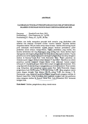 Putri, Kasofah Dwita (2021) Gambaran Tingkat Pengetahuan dan Sikap Mengenai Skabies Di Rumah Susun Bale Gede Baleendah 2021. Undergraduate thesis, Universitas Kristen Maranatha.