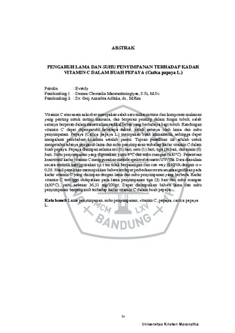 Vitamin C atau asam askorbat merupakan salah satu mikronutrien dan komponen makanan yang penting untuk nutrisi manusia, dan berperan penting dalam fungsi tubuh, salah satunya berperan dalam menetralkan radikal bebas yang berbahaya bagi tubuh. Kandungan vitamin C dapat dipengaruhi beberapa faktor, salah satunya oleh lama dan suhu penyimpanan. Pepaya (Carica papaya L.) merupakan buah klimakterik, sehingga dapat mengalami perubahan biokimia setelah panen. Tujuan penelitian ini adalah untuk mengetahui adanya pengaruh lama dan suhu penyimpanan terhadap kadar vitamin C dalam buah pepaya. Pepaya disimpan selama nol (0) hari, satu (1) hari, tiga (3) hari, dan enam (6) hari. Suhu penyimpanan yang digunakan, yaitu 4°C dan suhu ruangan (±30°C). Penentuan kuantitatif kadar vitamin C menggunakan metode spektrofotometri UV-Vis. Data dianalisis secara statistik menggunakan uji t tes tidak berpasangan dan one way ANOVA dengan = 0,05. Hasil penelitian menunjukkan bahwa terdapat perbedaan rerata secara signifikan pada kadar vitamin C yang disimpan dengan lama dan suhu penyimpanan yang berbeda. Kadar vitamin C tertinggi didapatkan pada lama penyimpanan tiga (3) hari dan suhu ruangan (±30°C), yaitu sebesar 36,51 mg/100gr. Dapat disimpulkan bahwa lama dan suhu penyimpanan berpengaruh terhadap kadar vitamin C dalam buah pepaya.