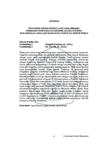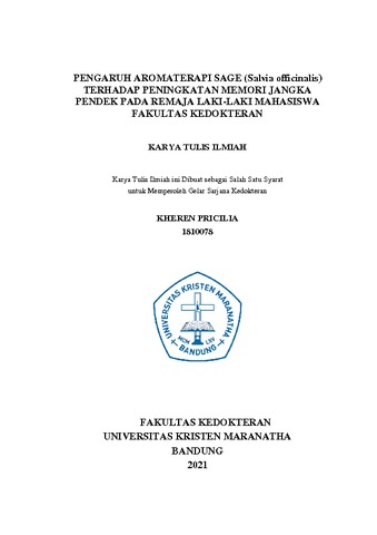 Pricilia, Kheren (2021) Pengaruh Aromaterapi Sage (Salvia officinalis) Terhadap Peningkatan Memori Jangka Pendek Pada Remaja Laki-Laki Mahasiswa Fakultas Kedokteran. Undergraduate thesis, Universitas Kristen Maranatha.