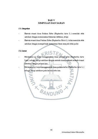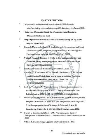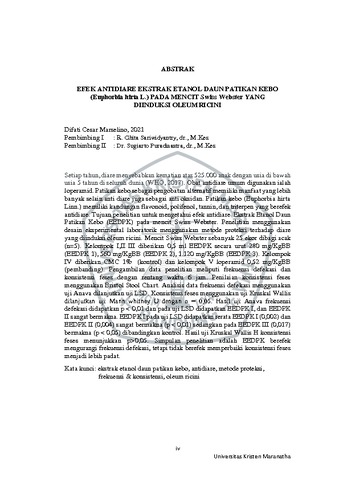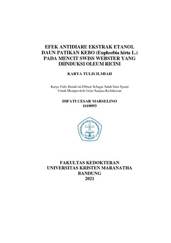 Marselino, Difati Cesar (2021) Efek Antidiare Ekstrak Etanol Daun Patikan Kebo (Euphorbia hirta L.) Pada Mencit Swiss Webster Yang Diinduksi Oleum Ricini. Undergraduate thesis, Universitas Kristen Maranatha.