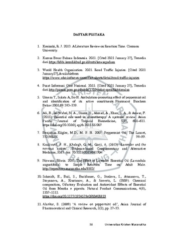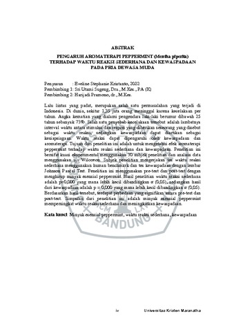Lalu lintas yang padat, merupakan salah satu permasalahan yang terjadi di Indonesia. Di dunia, sekitar 1,35 juta orang meninggal karena kecelakaan per tahun. Angka kematian yang dialami pengendara laki-laki berumur dibawah 25 tahun sebanyak 73%. Salah satu penyebab kecelakaan tersebut adalah lambatnya interval waktu antara stimulus dan respon yang diberikan seseorang yang disebut sebagai waktu reaksi, sedangkan kewaspadaan dapat diartikan sebagai kesiapsiagaan. Waktu reaksi dapat dipengaruhi oleh kewaspadaan dan aromaterapi. Tujuan dari penelitian ini adalah untuk mengetahui efek aromaterapi peppermint terhadap waktu reaksi sederhana dan kewaspadaan. Penelitian ini bersifat kuasi eksperimental menggunakan 30 subjek penelitian dan analisis data menggunakan uji Wilcoxon. Subjek penelitian mengerjakan tes waktu reaksi sederhana menggunakan human benchmark dan tes kewaspadaan dengan lembar Johnson Pascal Test. Penelitian ini menggunakan pre-test dan post-test dengan menghirup minyak esensial peppermint. Hasil penelitian waktu reaksi sederhana adalah p=0,000 yang mana lebih kecil dibandingkan