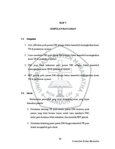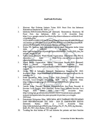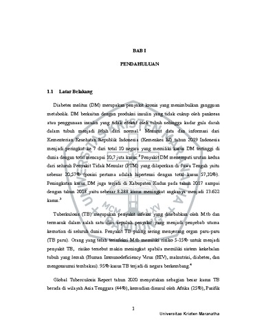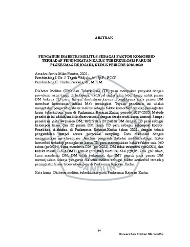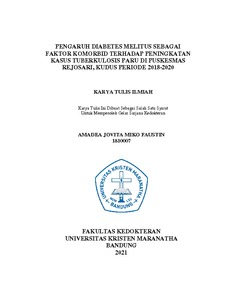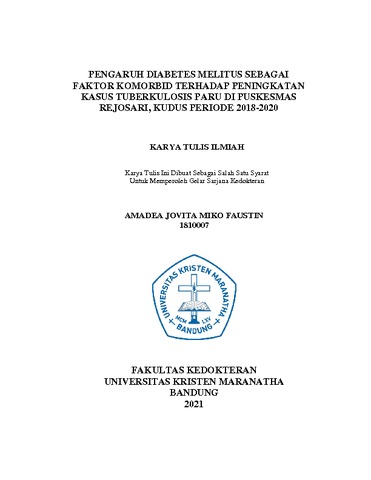 Faustin, Amadea Jovita Miko (2021) Pengaruh Diabetes Melitus Sebagai Faktor Komorbid Terhadap Peningkatan Kasus Tuberkulosis Paru Di Puskesmas Rejosari, Kudus Periode 2018-2020. Undergraduate thesis, Universitas Kristen Maranatha.