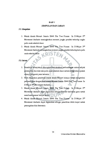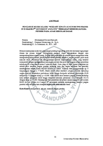 Hariyadi, Muhammad Devara (2022) "Pengaruh Musik Klasik “Mozart Sonata K448 For Two Pianos In D-Major 2Nd Movement Andante” Terhadap Memori Jangka Pendek Pada Anak Sekolah Dasar". Undergraduate thesis, Universitas Kristen Maranatha.