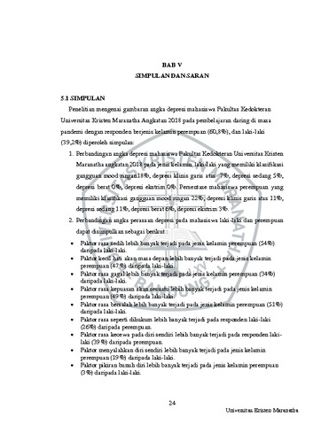 Depresi merupakan gangguan mental umum yang ditandai dengan kesedihan yang terus menerus dan berkurangnya minat atau kesenangan dalam kegiatan yang sebelumnya bermanfaat atau menyenangkan. Tahun 2017 WHO melaporkan adanya 35 juta kasus depresi di dunia. Riset Kesehatan Dasar tahun 2018 melaporkan depresi sudah mulai terjadi sejak usia remaja dengan prevalensi 6,1% jiwa dan hanya 9% yang menjalani pengobatan medis. Kejadian tersebut semakin meningkat pada usia lebih dari 75 tahun. Tujuan penelitian ini adalah untuk melihat gambaran angka depresi mahasiswa Fakultas Kedokteran Universitas Kristen Maranatha angkatan 2018 selama pembelajaran daring di masa pandemi. Penelitian dilakukan secara deskriptif dengan metode kuota sampling menggunakan kuesioner Beck’s Depression Inventory yang disebarkan kepada 97 responden, kemudian diolah menggunakan SPSS. Hasil penelitian menunjukkan 20,62% mahasiswa mengalami gangguan mood ringan, 10,31% mengalami depresi klinis garis batas, 9,28% mengalami depresi sedang, 4,12% mengalami depresi berat, dan 2,06% depresi ekstrim. Beberapa faktor penentu derajat depresi yang lebih banyak terjadi pada jenis kelamin perempuan adalah faktor rasa sedih (54%), kecil hati akan masa depan (47%), rasa gagal (34%), kepuasan akan sesuatu (49%), rasa bersalah (51%), menyalahkan diri sendiri (19%), pikiran bunuh diri (3%), menangis (42%), khawatir akan kesehatan (32%).