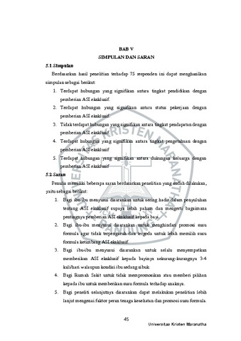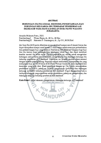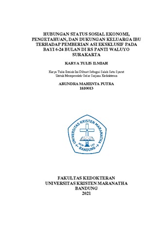 Putra, Arundra Mahenta (2021) "Hubungan Status Sosial Ekonomi, Pengetahuan, dan Dukungan Keluarga Ibu Terhadap Pemberian Asi Eksklusif Pada Bayi 6-24 Bulan di RS Panti Waluyo Surakarta". Undergraduate thesis, Universitas Kristen Maranatha.