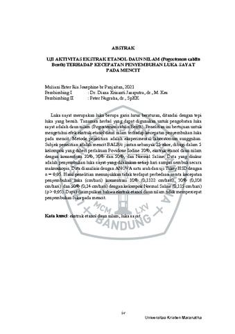 Br Panjaitan, Muliani Ester Ria Josephine (2022) Uji Aktivitas Ekstrak Etanol Daun Nilam (Pogostemon Cablin Benth) Terhadap Kecepatan Penyembuhan Luka Sayat Pada Mencit. Undergraduate thesis, Universitas Kristen Maranatha.