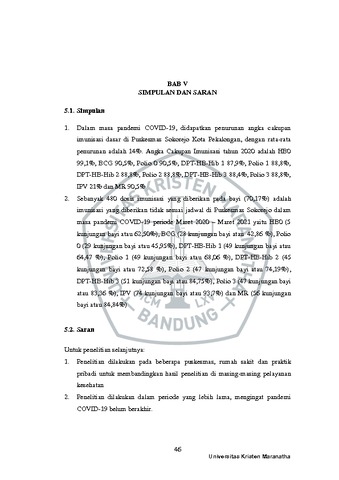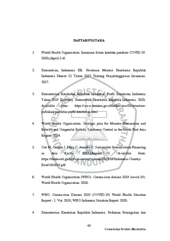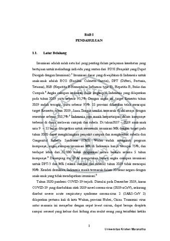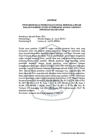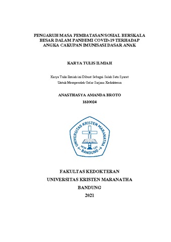 Broto, Anasthasya Amanda (2021) "Pengaruh Masa Pembatasan Sosial Berskala Besar Dalam Pandemi Covid-19 Terhadap Angka Cakupan Imunisasi Dasar Anak". Undergraduate thesis, Universitas Kristen Maranatha.
