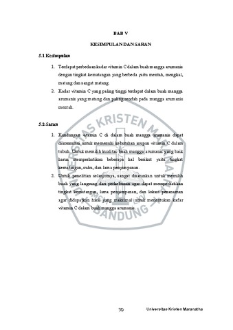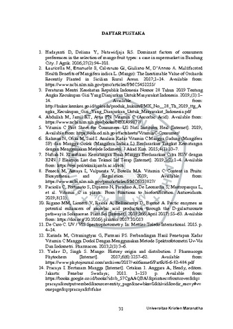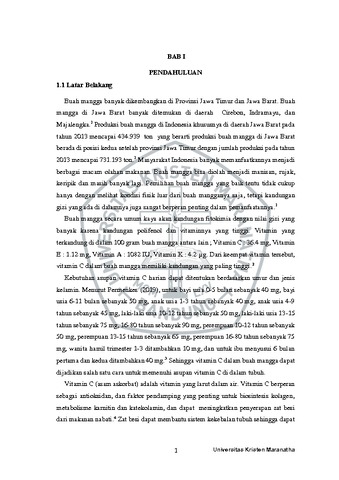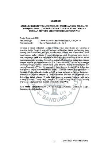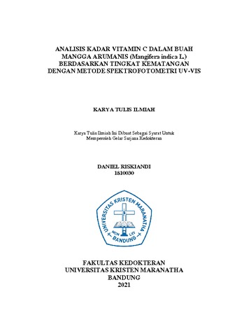 Riskiandi, Daniel (2021) "Analisis Kadar Vitamin C Dalam Buah Mangga Arumanis (Mangifera Indica L.) Berdasarkan Tingkat Kematangan Dengan Metode Spektrofotometri Uv-Vis". Undergraduate thesis, Universitas Kristen Maranatha.