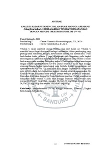 Vitamin C (asam askorbat) adalah vitamin yang larut dalam air. Vitamin C memiliki banya fungsi diantaranya sebagai antioksidan, faktor pendamping yang penting untuk biosintesis kolagen, metabolisme karnitin dan katekolamin. Pada buah-buahan kadar vitamin C juga dipengaruhi oleh tergantung pada tingkat kematangannya. Penelitian ini bertujuan untuk menganalisis kadar vitamin C dalam buah mangga jenis arumanis (Mangifera indica L.) berdasarkan tingkat kematangan dengan metode spektrofotometri UV-Vis. Kadar vitamin C dalam buah mangga arumanis dengan tingkat kematangan yang berbeda diukur menggunakan alat spektrofotometri UV-Vis. Uji normalitas data dengan Saphiro-Wilk didapatkan nilai p>0,05 artinya data terdistribusi normal. Analisis statistik menggunakan Uji Kruskall-Wallis didapatkan nilai p<0,05 artinya terdapat perbedaan bermakna. Kemudian dilanjutkan dengan Uji Dunn-Bonferroni post-hoc. Dalam penelitian ini didapatkan kadar vitamin C pada buah mangga arumanis berturut-turut yaitu matang 26,43±2,77 (mg/100g), mengkal 26,31±1,34 (mg/100g), sangat matang 24,57±1,13 (mg/100g) dan mentah 18,85±0,47 (mg/100g)