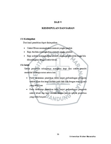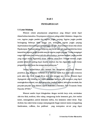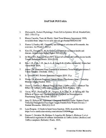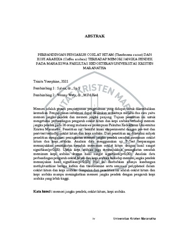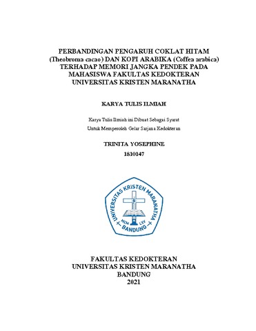 Yosephine, Trinita (2022) Perbandingan Pengaruh Coklat Hitam (Theobroma Cacao) Dan Kopi Arabika (Coffea Arabica) Terhadap Memori Jangka Pendek Pada Mahasiswa Fakultas Kedokteran Universitas Kristen Maranatha. Undergraduate thesis, Universitas Kristen Maranatha.