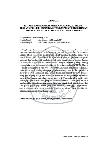 Rumondang, Seraphine Diva (2022) Insidensi Dan Karakteristik Gagal Ginjal Kronis Dengan Stroke Di Rumah Sakit Umum Pusat Dokter Hasan Sadikin Bandung Periode Juni 2019 – Desember 2019. Undergraduate thesis, Universitas Kristen Maranatha.