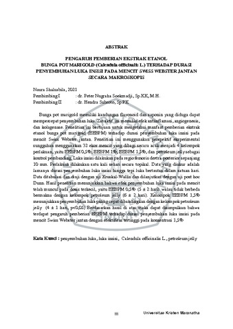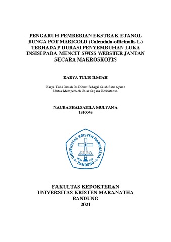 Mulyana, Naura Shalsabila (2022) Pengaruh Pemberian Ekstrak Etanol Bunga Pot Marigold (Calendula Officinalis L.) Terhadap Durasi Penyembuhan Luka Insisi Pada Mencit Swiss Webster Jantan Secara Makroskopis. Undergraduate thesis, Universitas Kristen Maranatha.
