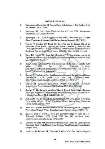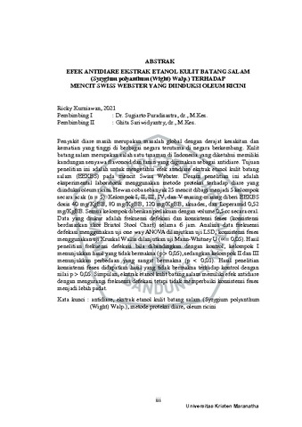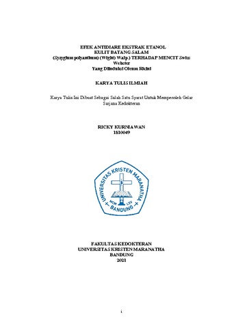 Kurniawan, Ricky (2022) Efek Antidiare Ekstrak Etanol Kulit Batang Salam (Syzygium Polyanthum) (Wight) Walp.) Terhadap Mencit Swiss Webster Yang Diinduksi Oleum Ricini. Undergraduate thesis, Universitas Kristen Maranatha.
