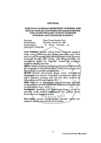 Putri, Risha Diranti Ananda (2022) Hubungan Gambaran Left Ventricular Hypertrophy Dengan Jumlah Lesi Pembuluh Darah Koroner Pada Pasien Penyakit Jantung Koroner Di Rumah Sakit Immanuel Bandung. Undergraduate thesis, Universitas Kristen Maranatha.