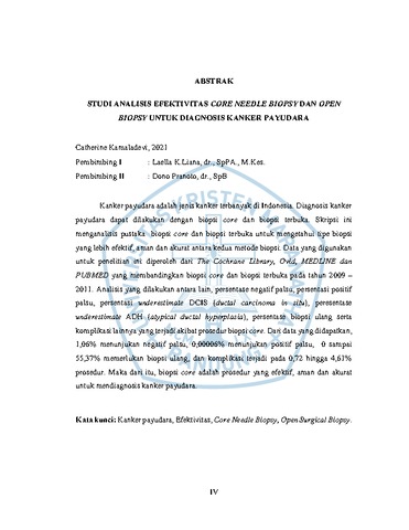 Kanker payudara adalah jenis kanker terbanyak di Indonesia. Diagnosis kanker payudara dapat dilakukan dengan biopsi core dan biopsi terbuka. Skripsi ini menganalisis pustaka biopsi core dan biopsi terbuka untuk mengetahui tipe biopsi yang lebih efektif, aman dan akurat antara kedua metode biopsi. Data yang digunakan untuk penelitian ini diperoleh dari The Cochrane Library, Ovid, MEDLINE dan PUBMED yang membandingkan biopsi core dan biopsi terbuka pada tahun 2009 – 2011. Analisis yang dilakukan antara lain, persentase negatif palsu, persentasi positif palsu, persentasi underestimate DCIS (ductal carcinoma in situ), peresentase underestimate ADH (atypical ductal hyperplasia), persentase biopsi ulang serta komplikasi lainnya yang terjadi akibat prosedur biopsi core. Dari data yang didapatkan, 1,06% menunjukan negatif palsu, 0,00006% menunjukan positif palsu, 0 sampai 55,37% memerlukan biopsi ulang, dan komplikasi terjadi pada 0,72 hingga 4,61% prosedur. Maka dari itu, biopsi core adalah prosedur yang efektif, aman dan akurat untuk mendiagnosis kanker payudara.