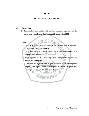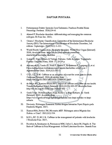 Abigail, Stevani (2022) "Pengaruh Kafein Dalam Kopi Terhadap Nyeri Kepala Primer Pasien Rumah Sakit Immanuel Bandung Tahun 2021". Undergraduate thesis, Universitas Kristen Maranatha.