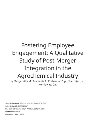 M. , Margaretha and F. , Prajnanta and S.P., Prabandari and N., Noermijati (2024) Fostering Employee Engagement: A Qualitative Study of Post-Merger Integration in the Agrochemical Industry. Polish Journal of Management Studies, 29 (2). pp. 380-393. ISSN 2081-7452