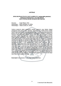 Sindrom metabolik adalah sekumpulan kelainan metabolik yang ditandai dengan peningkatan kadar glukosa darah, hipertensi, dislipidemia dan obesitas sentral. Kondisi tersebut dapat menyebabkan akumulasi lipid pada hepar. Tanaman yang dapat menurunkan glukosa dan lipid darah adalah daun sambiloto (Andrographis paniculata). Penelitian ini bertujuan untuk mengetahui pengaruh ekstrak etanol daun sambiloto (EEDS) terhadap perubahan volume hepar pada tikus. Penelitian ini bersifat eksperimental laboratorium dengan rancangan acak lengkap. Tikus Wistar jantan dibagi menjadi 5 kelompok (n=6) dan tikus pada kelompok 1-4 akan diinduksi pakan tinggi lemak dan fruktosa (PTL-F) menjadi sindrom metabolik kecuali kelompok normal. Semua kelompok akan diinduksi PTL-F selama 64 hari dan pada hari ke-50 akan diberi perlakuan: kelompok EEDS 1 (dosis 100 mg/kgBB/hari), EEDS 2 (200 mg/kgBB/hari), kontrol positif (metformin dosis 0,5 mg/kgBB), kontrol negatif (tikus yang hanya diinduksi PTL-F), dan kontrol normal (tikus tanpa induksi PTL-F). Saat hari ke-64, tikus dikorbankan untuk pengambilan hepar. Data yang diukur adalah volume hepar tikus sindrom metabolik menggunakan metode design�based stereology. Analisis data dilakukan menggunakan ANOVA satu arah dilanjutkan dengan uji post-HocTukey LSD (α=0,05). Hasil penelitian menunjukkan bahwa pemberian EEDS baik dosis 100 mg/kgBB/hari dan 200 mg/kgBB/hari tidak menunjukkan perbedaan yang signifikan dengan kelompok kontrol negatif (p>0,05). Simpulan dari penelitian ini adalah ekstrak etanol daun sambiloto tidak berpengaruh terhadap perubahan volume hepar tikus Wistar model sindrom metabolik.