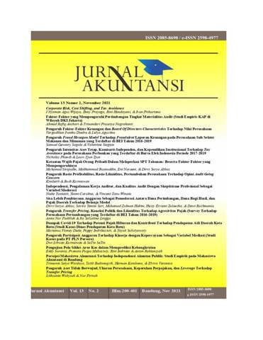 Yunianti, Nieke and Carolina, Yenni and Winata, Vincent Tanu (2021) Independensi, Pengalaman Kerja Auditor, dan Kualitas Audit Dengan Skeptisisme Profesional Sebagai Variabel Moderasi. Jurnal Akuntansi, 13 (2). pp. 300-315. ISSN 2598-4977