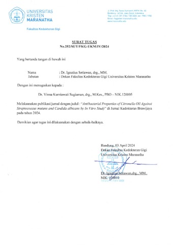 Sugiaman, Vinna K. and Widowati, Wahyu and Kusuma, Hanna Sari W. and Salsabila, Nindia and Rizal, Rizal (2024) Antibacterial and Antifungal Properties of Citronella oil Against Streptococcus mutans and Candida albicans by In Vitro Study. Jurnal Kedokteran Brawijaya, 33 (1). pp. 1-5. ISSN 2338-0772