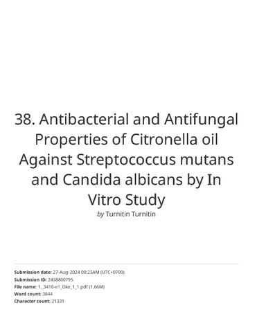 38. Turnitin - Antibacterial and Antifungal Properties of Citronella oil Against Streptococcus mutans and Candida albicans by In Vitro Study.pdf Download (1459Kb) | Preview |