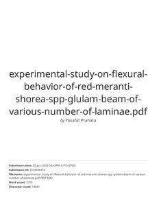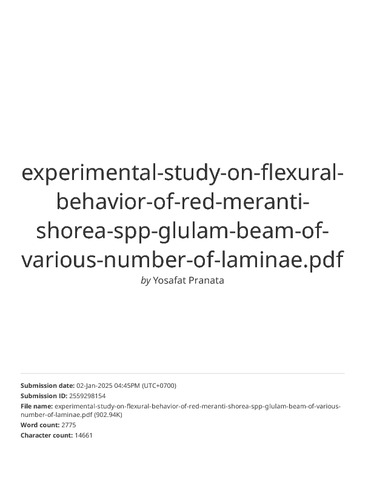 Pranata, Yosafat Aji and Suryoatmono, Bambang (2024) Experimental Study of Flexural Behavior of Red Meranti (Shorea SPP.) Glulam Beam of Various Number of Laminae. Wood Research, 69 (4). pp. 721-729. ISSN 2729-8906