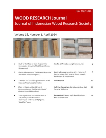 Pranata, Yosafat Aji and Kristianto, Anang and Novi, Novi (2024) Study of the Effect of Grain Angle on the Compressive Strength of Red Meranti Timber (Shorea spp.). Wood Research Journal, 15 (1). pp. 1-7. ISSN 2087-3840