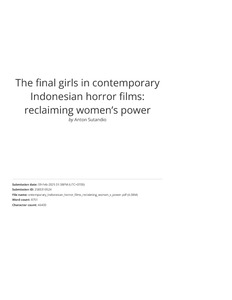 Sutandio, Anton (2023) The Final Girls in Contemporary Indonesian Horror Films: Reclaiming Women’s Power. Cogent Arts & Humanities, 10 (1). ISSN 2331-1983