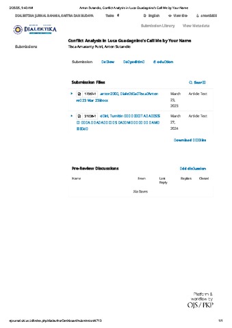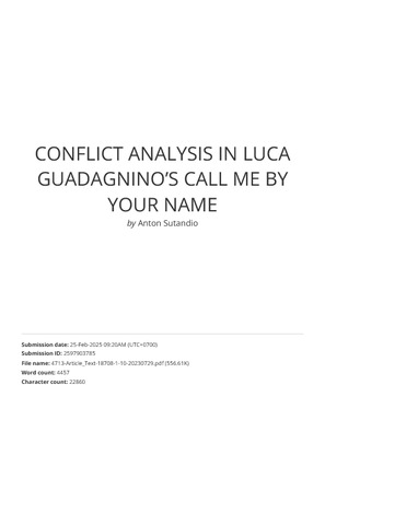 Putri, Tisca Amaranty and Sutandio, Anton (2023) Conflict Analysis in Luca Guadagnino's Call Me by Your Name. Dialektika: Jurnal Bahasa, Sastra, dan Budaya, 10 (1). pp. 128-139. ISSN 2798-1371