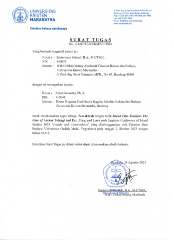 Sutandio, Anton (2023) Island of Tourism: The Case of Laskar Pelangi and Eat, Pray, and Love. In: Third International Conference on Critical Island Studies, October 2, 2023, Yogyakarta.