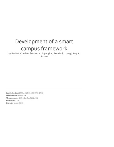 Imbar, Radiant Victor and Supangkat, Suhono Harso and Langi, Armein Z.R. and Arman, Arry A. (2022) Development of a smart campus framework. World Transactions on Engineering and Technology Education, 20 (4). pp. 292-299. ISSN 1446-2257