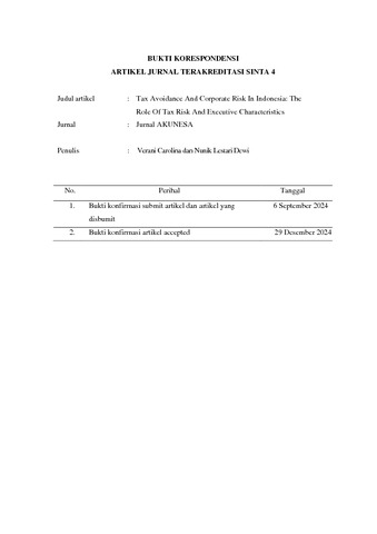 Carolina, Verani and Dewi, Nunik Lestari and Asher, Steven (2024) Tax Avoidance And Corporate Risk In Indonesia: The Role Of Tax Risk And Executive Characteristics. Akunesa: Jurnal Akuntansi Unesa, 13 (1). pp. 62-72.