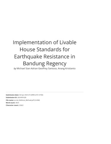 Santoso, Michael Sian Adrian Geoffrey and Kristianto, Anang (2023) Implementation of Livable House Standards for Earthquake Resistance in Bandung Regency. Journal of Innovation and Community Engagement, 4 (3). pp. 192-207. ISSN 2776-0421