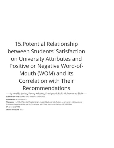 Junita, Imelda and Kristine, Fanny and Sherlywati, Sherlywati and Sidik, Rizki Muhammad (2021) Potential Relationship between Students’ Satisfaction on University Attributes and Positive or Negative Word-of-Mouth (WOM) and Its Correlation with Their Recommendations. In: 1st International Conference on Emerging Issues in Humanity Studies and Social Sciences, 1-2 July 2021, Bandung.